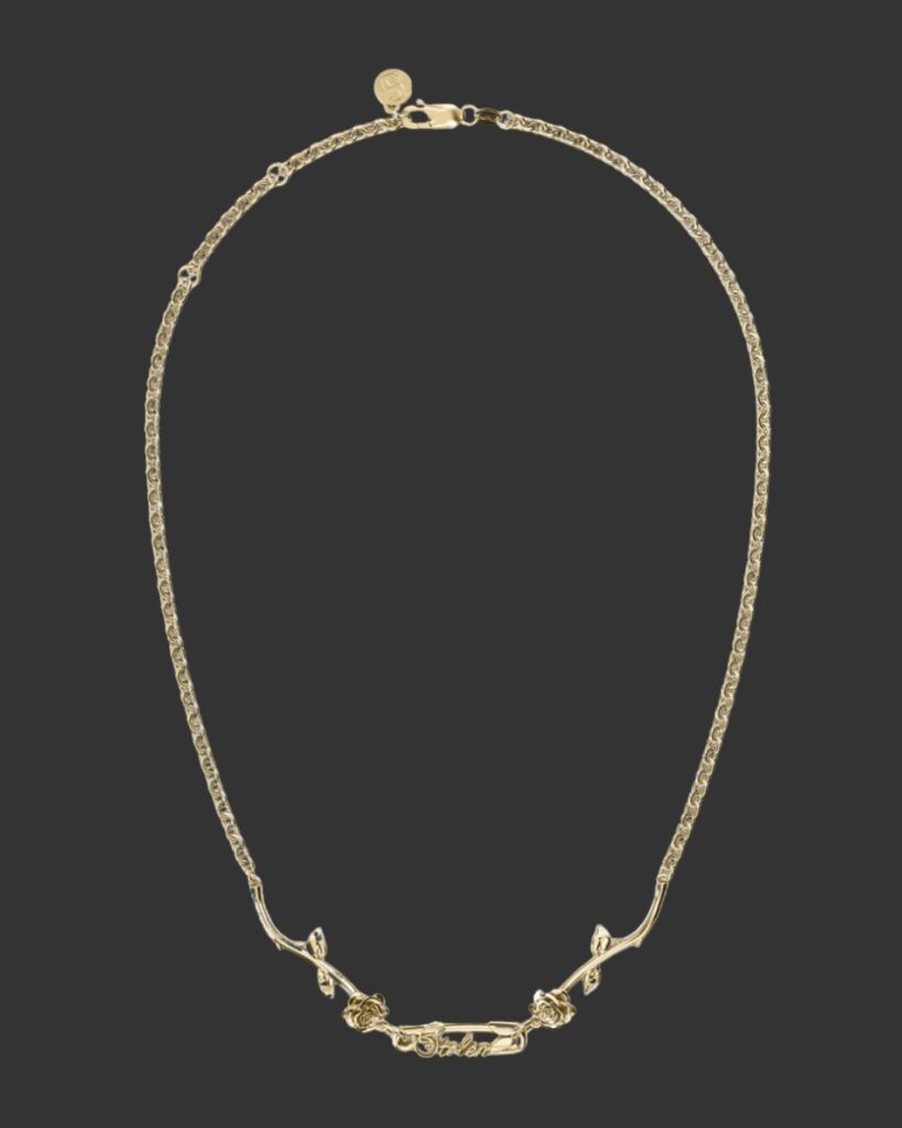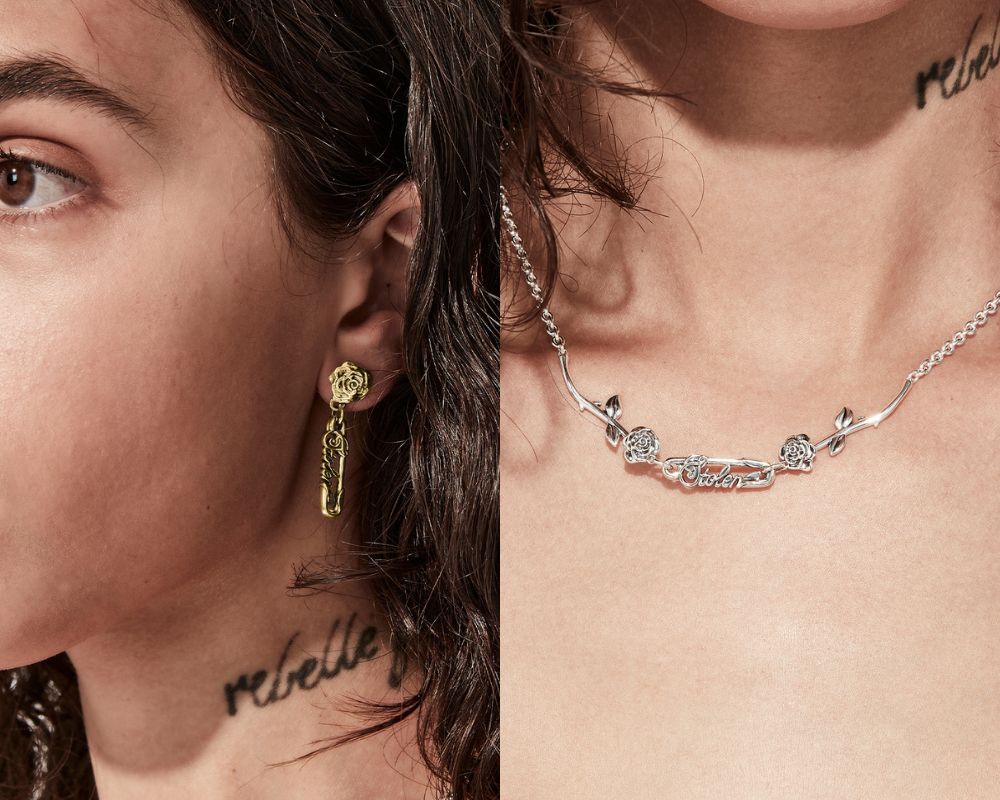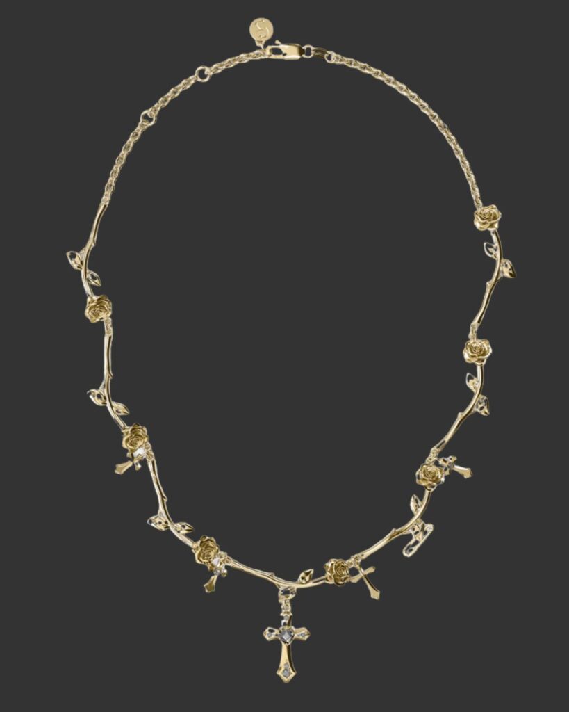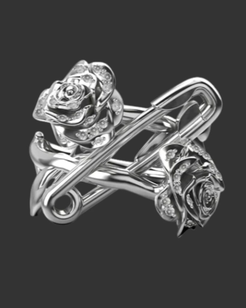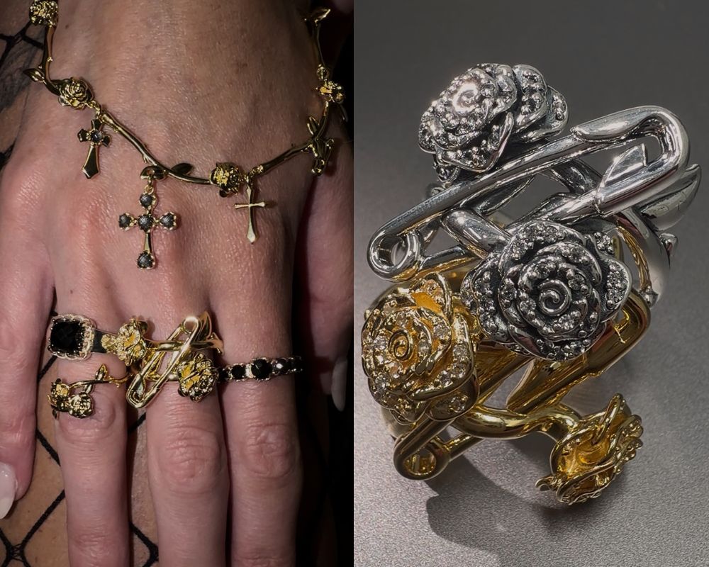 Described as “a love letter penned in safety pins and thorns,” the collection reimagines the house’s enduring punk codes through a sharper, more sculptural lens. Think intricate stem roses linked like gothic daisy chains. Safety pins softened with script detailing. Pavé stones catching the light like a knowing glance across the room. Romantic, yes – but never saccharine. Sentimental, but with bite.