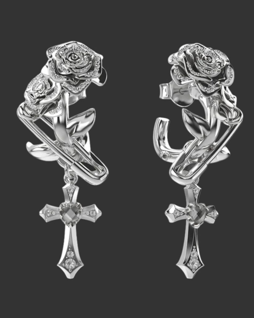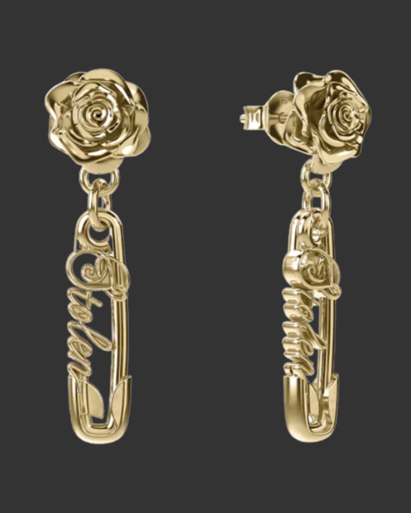 Drop studs with sculpted roses and safety pin silhouettes – a sleek balance of floral delicacy and punk edge that feels timeless yet audacious.