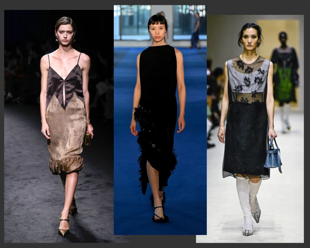 Fashion month also revealed a softer counterpoint to structured tailoring. Runways were filled with fringe, satin finishes, lace and delicate embellishments, emphasising fluidity and tactile surfaces. Fringe detailing in particular appeared on dresses, skirts and outerwear across multiple collections.