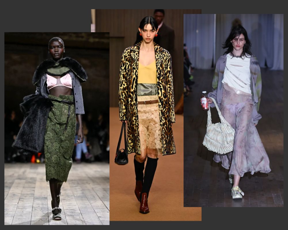 Layering evolved beyond practicality into a central styling language. Designers stacked multiple garments in unexpected combinations – dresses over trousers, knits over shirting over sheer layers – creating depth and visual complexity. The result felt personal and intuitive, echoing real-world dressing but elevated to an editorial extreme.