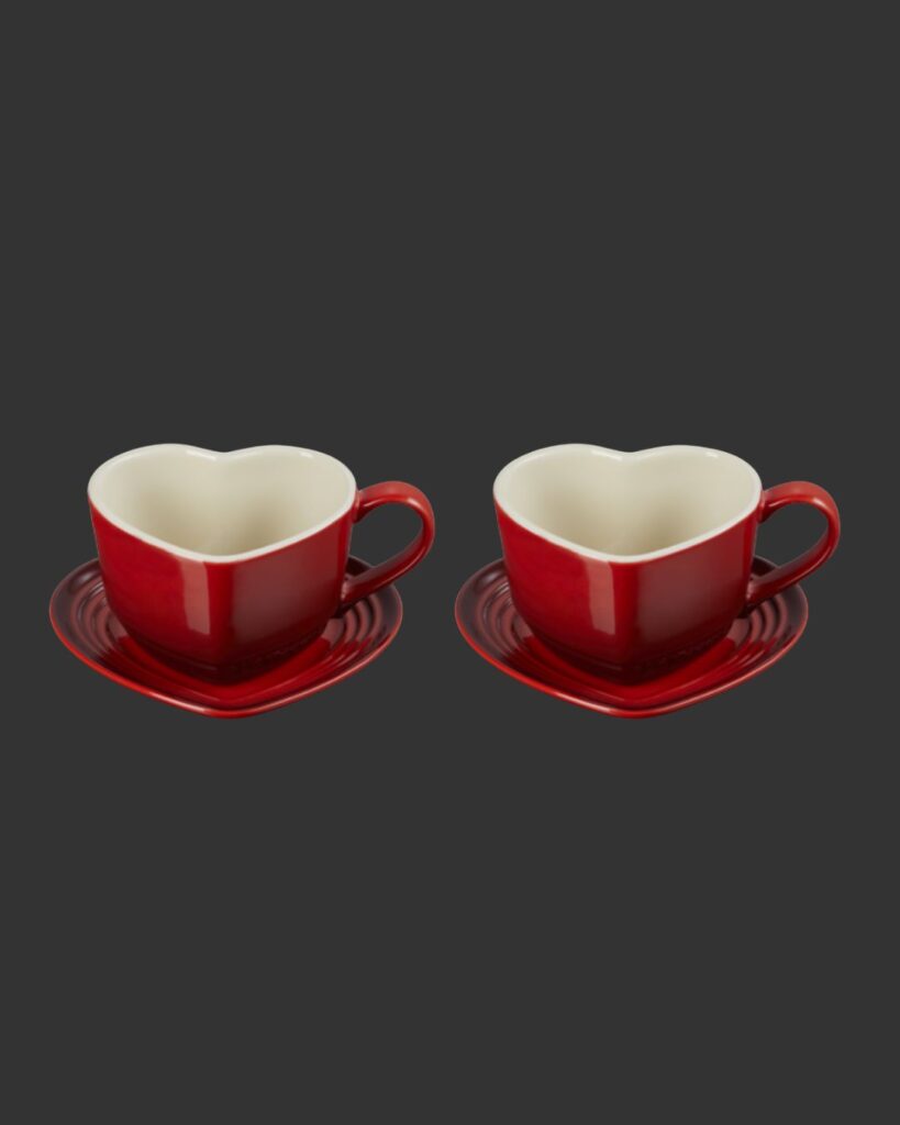 Le Creuset Stoneware Set of 2 Heart Mugs with Saucers, $145